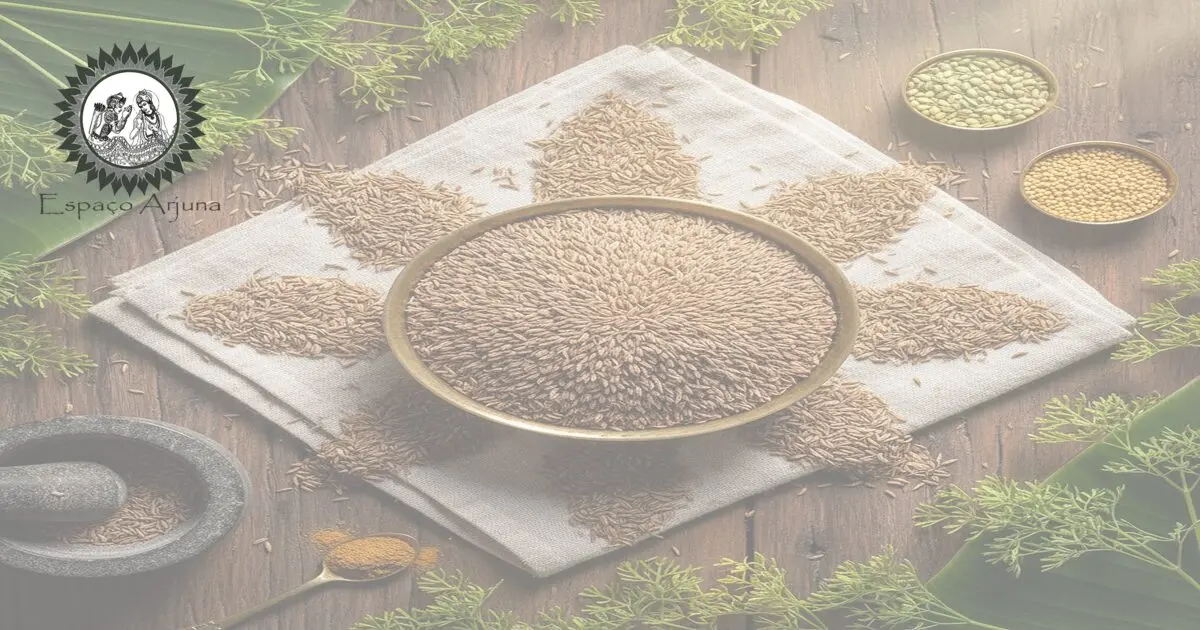 O cominho — Cuminum cyminum — é uma semente que atravessou continentes e cozinhas, condensando em seu aroma uma história de uso culinário, ritual e conhecimento médico-tradicional. Na tradição ayurvédica ele aparece sob o nome jīraka – जीरक, integrando-se tanto ao paladar quanto às classificações teóricas que sustentam o conhecimento das substâncias. Este texto propõe um olhar cuidadoso sobre o cominho a partir do paradigma do sapta padārtha – सप्त पदार्थ e do dravyaguṇa – द्रव्यगुण, tentando traduzir categorias clássicas em termos acessíveis ao leitor contemporâneo. O objetivo é iluminar como princípios tradicionais informam escolhas de uso, combinação e conservação do cominho no cotidiano sensorial e culinário, sem transformar analogias em prescrições clínicas.