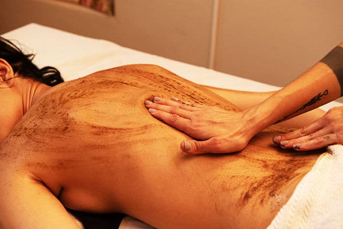 Fricção seca com pós de ervas em movimentos ascendentes. Tradicionalmente utilizada para despertar o corpo, trazer leveza e vitalidade, podendo anteceder outras práticas.