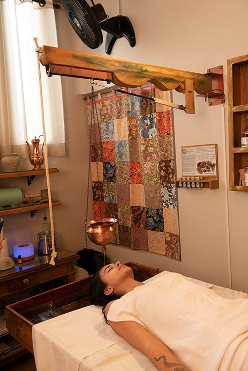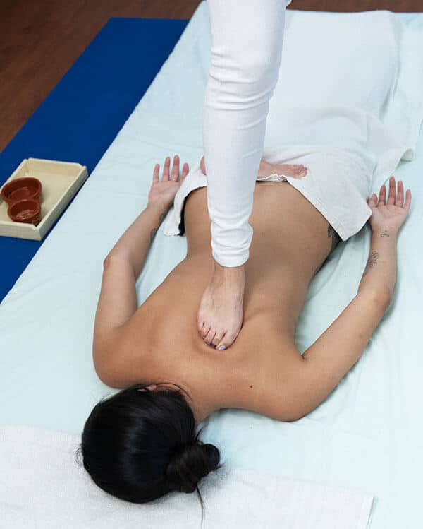 Técnica tradicional de toques graduados em pontos específicos (marma) ao longo do corpo, com atenção à respiração e ao ritmo da sessão.